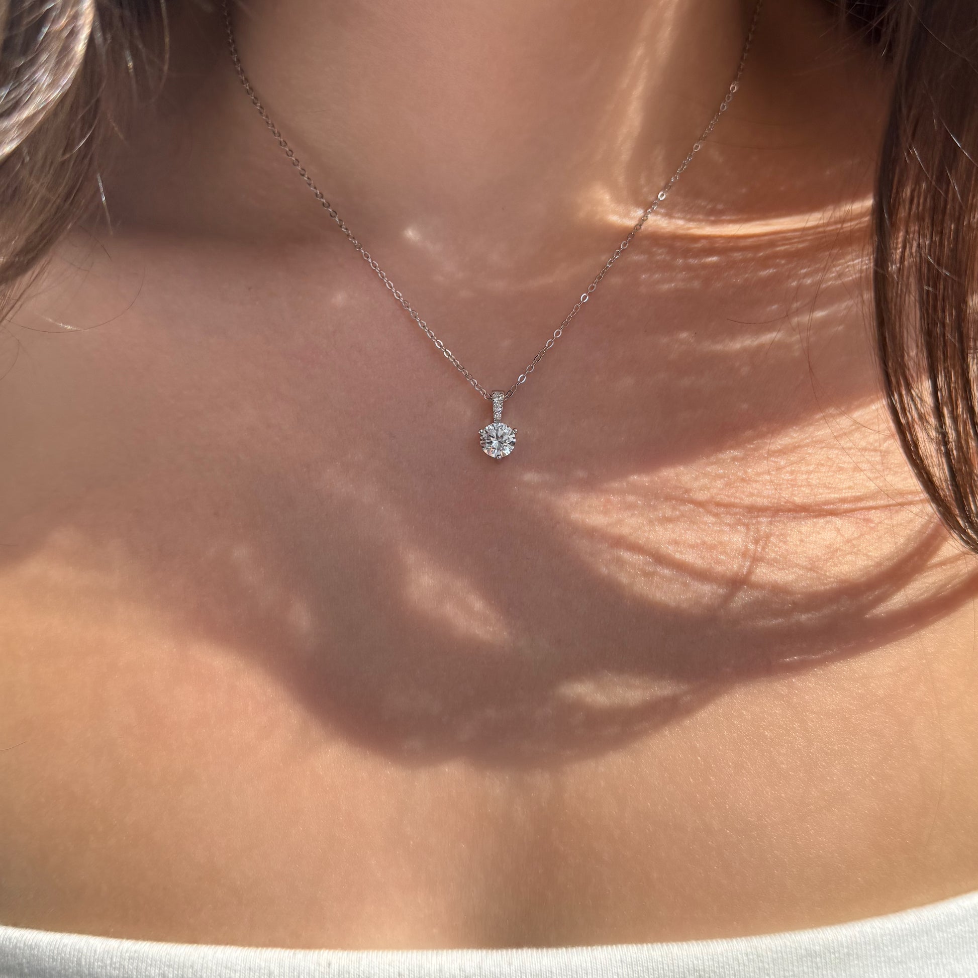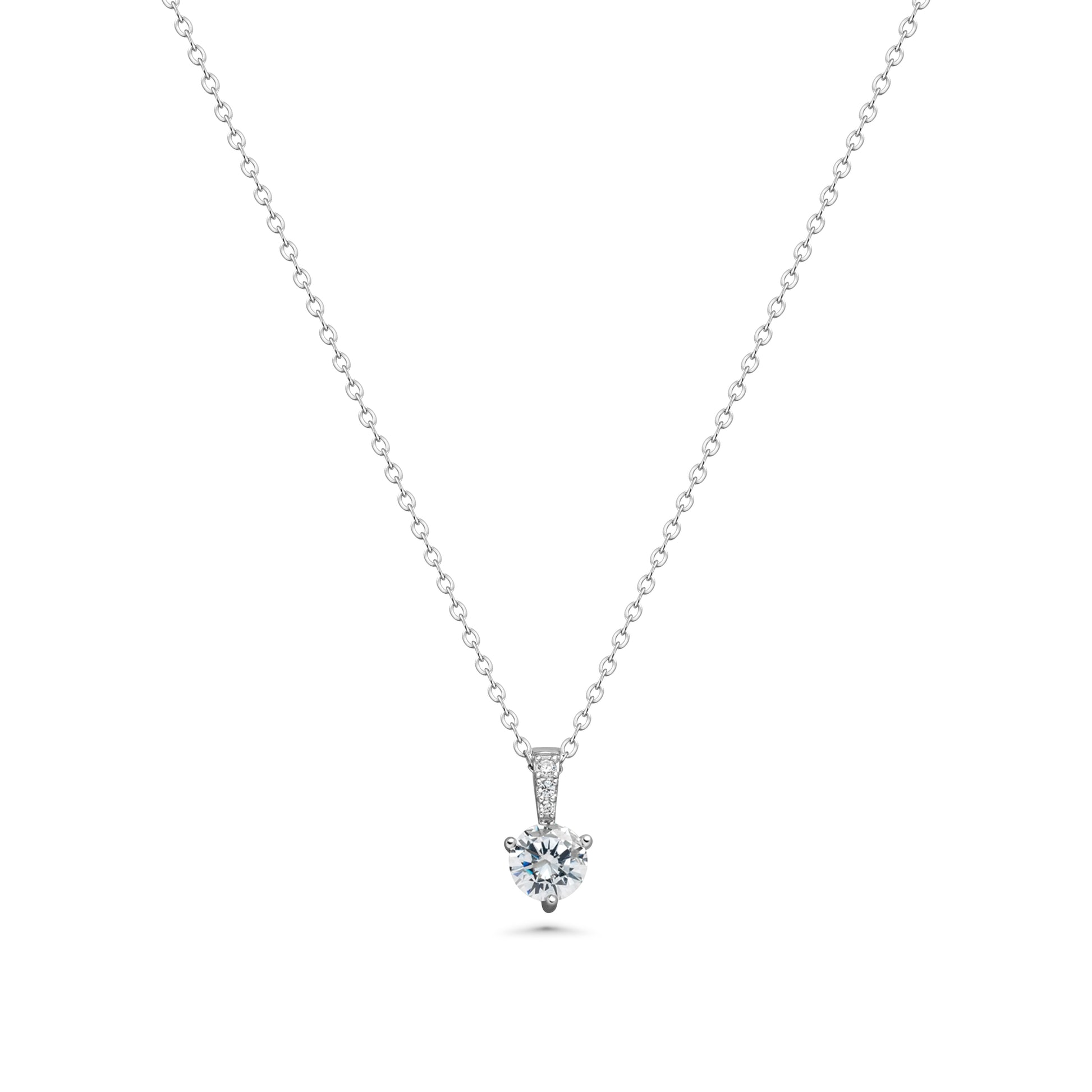 Add a touch of timeless elegance to your jewelry collection with this classic solitaire pendant necklace. Expertly crafted from genuine 925 sterling silver and coated with premium rhodium for enhanced durability and a brilliant, tarnish-resistant finish. The centerpiece features a sparkling round-cut stone, set in a refined claw setting that allows maximum light reflection for exceptional brilliance. Suspended from a delicate silver chain, this necklace transitions effortlessly from day to night, making it perfect for both everyday wear and special occasions.